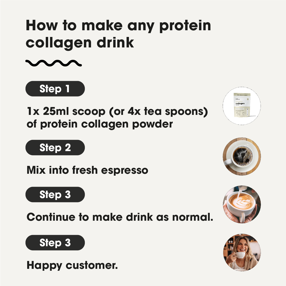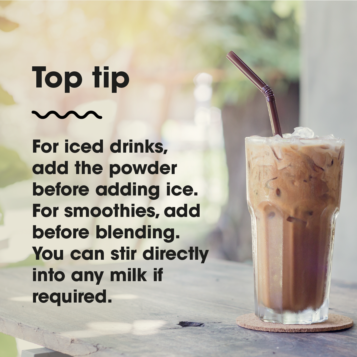 Mix 4 large teaspoons or 1x 25ml scoop into any hot or cold drink.